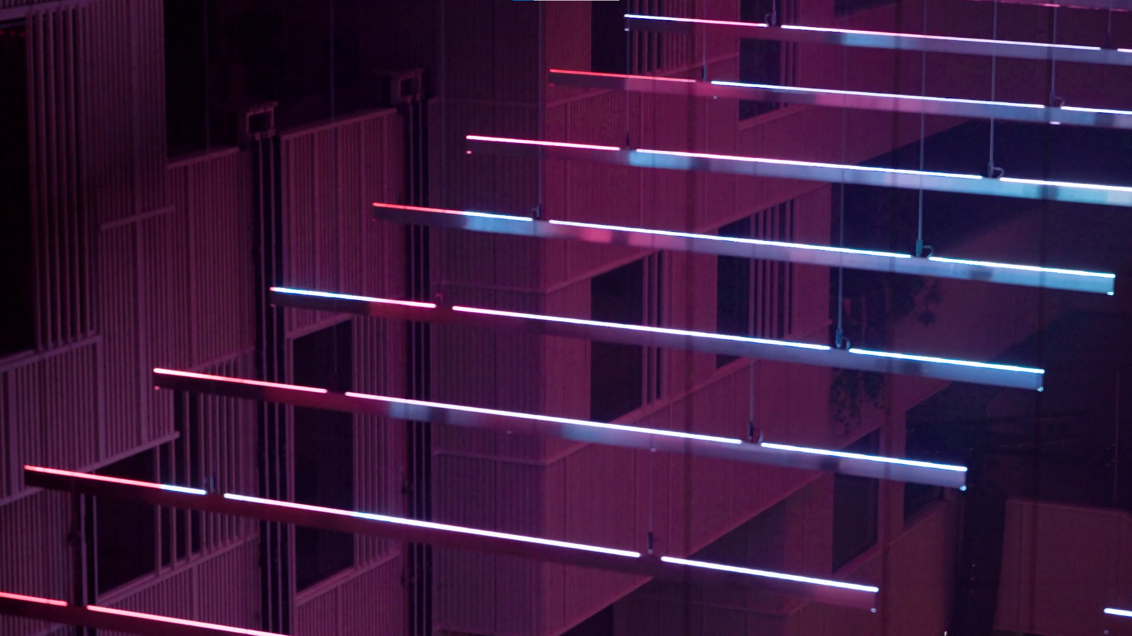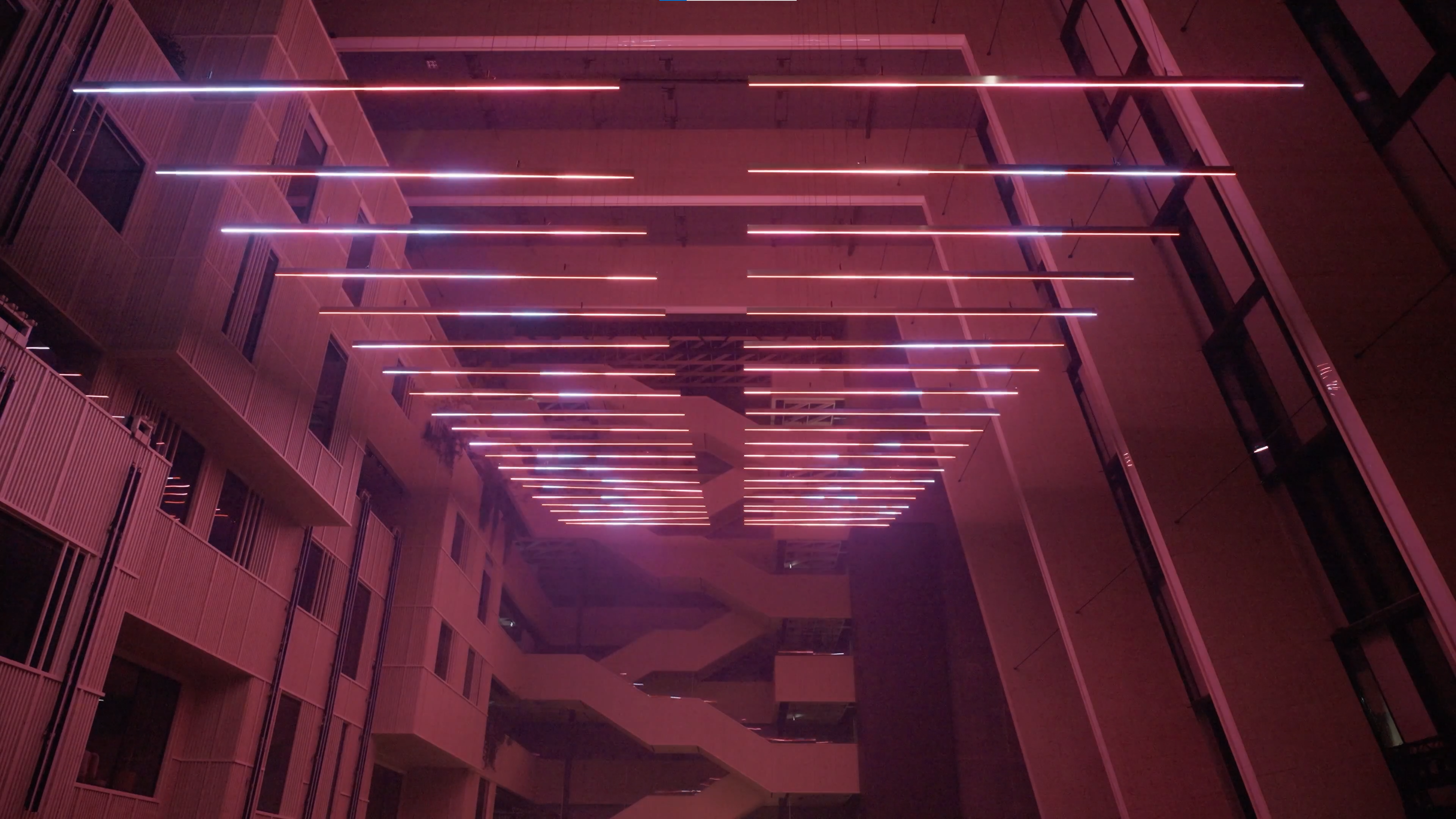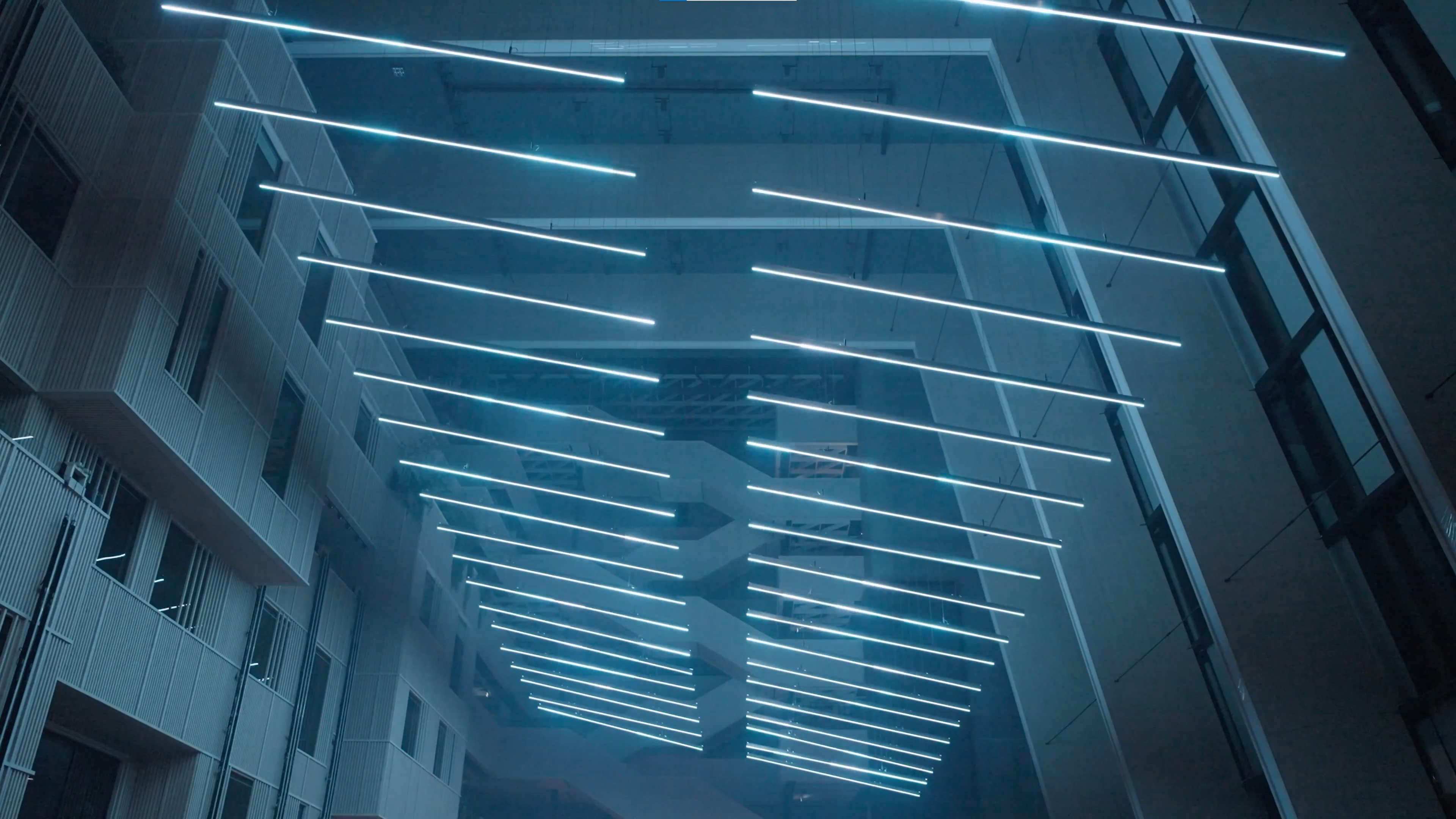 40 – 6-meter-long LED bars are lifted precisely up and down, creating a dynamic light display in the Construction City’s 9-story lobby. The LED bars travel 20 meters in the enormous room, providing an interesting atmosphere for the many people working in the building.