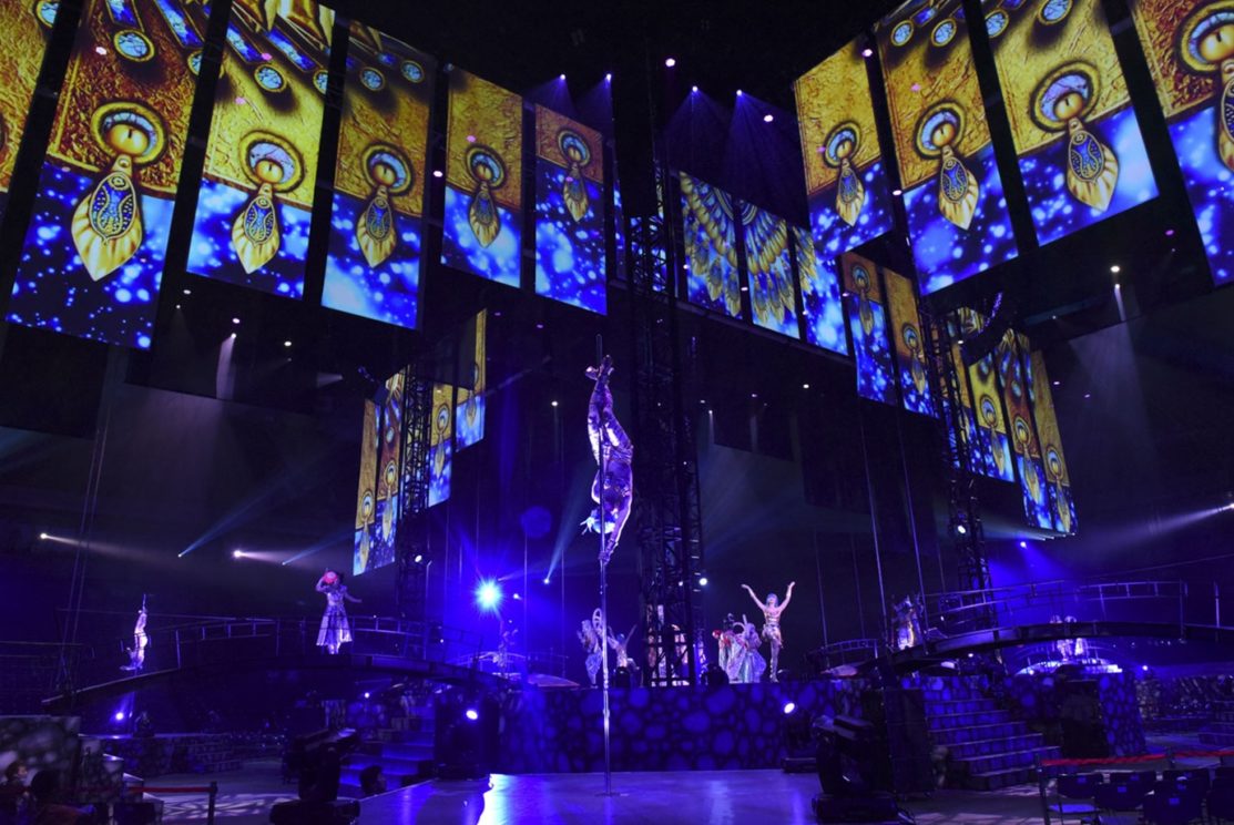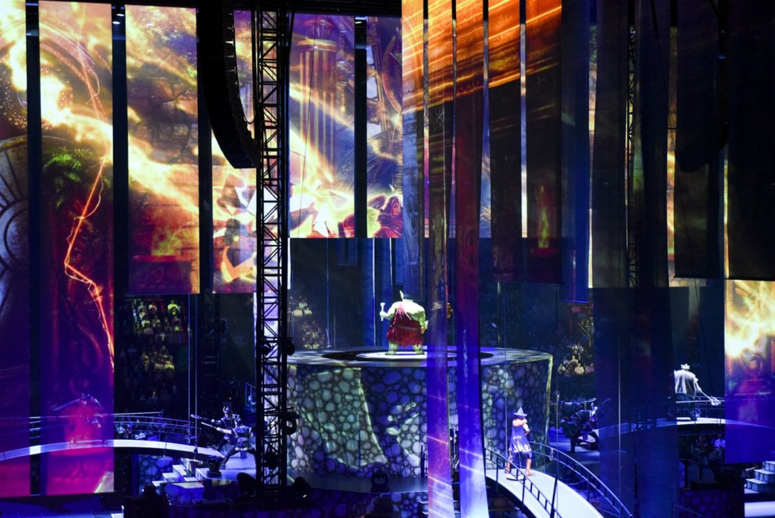 The roll down screen rise and fall to provide an ever-changing projection landscape. Linked together with multiple performer fly tracks, the games characters blend into the projected animation to give the audience the immersive environment of their game. Stufish Architects designed a set that would allow the game characters to embark on their quest through an elaborate and expansive stage layout covering the entire arena floor.
