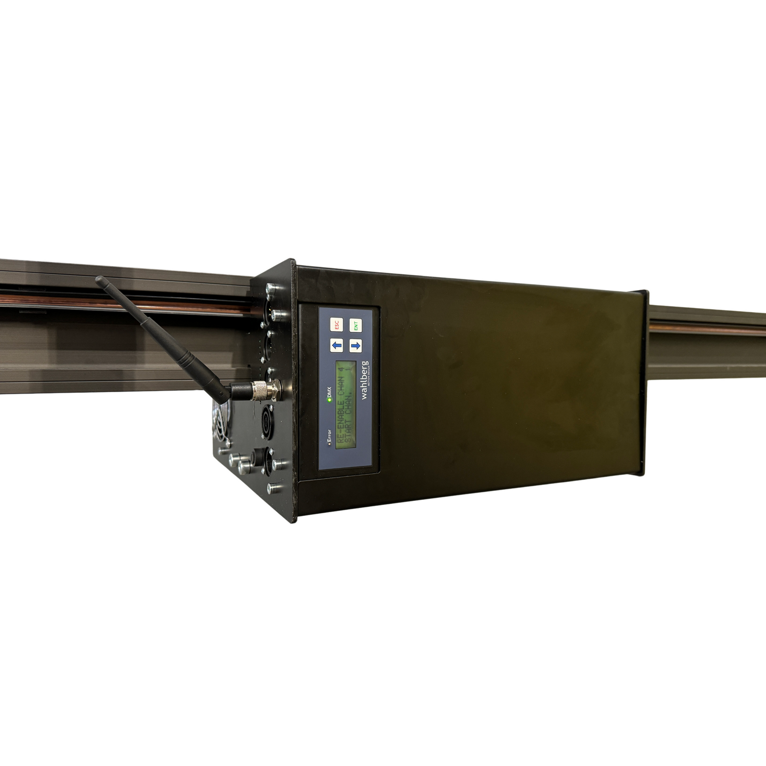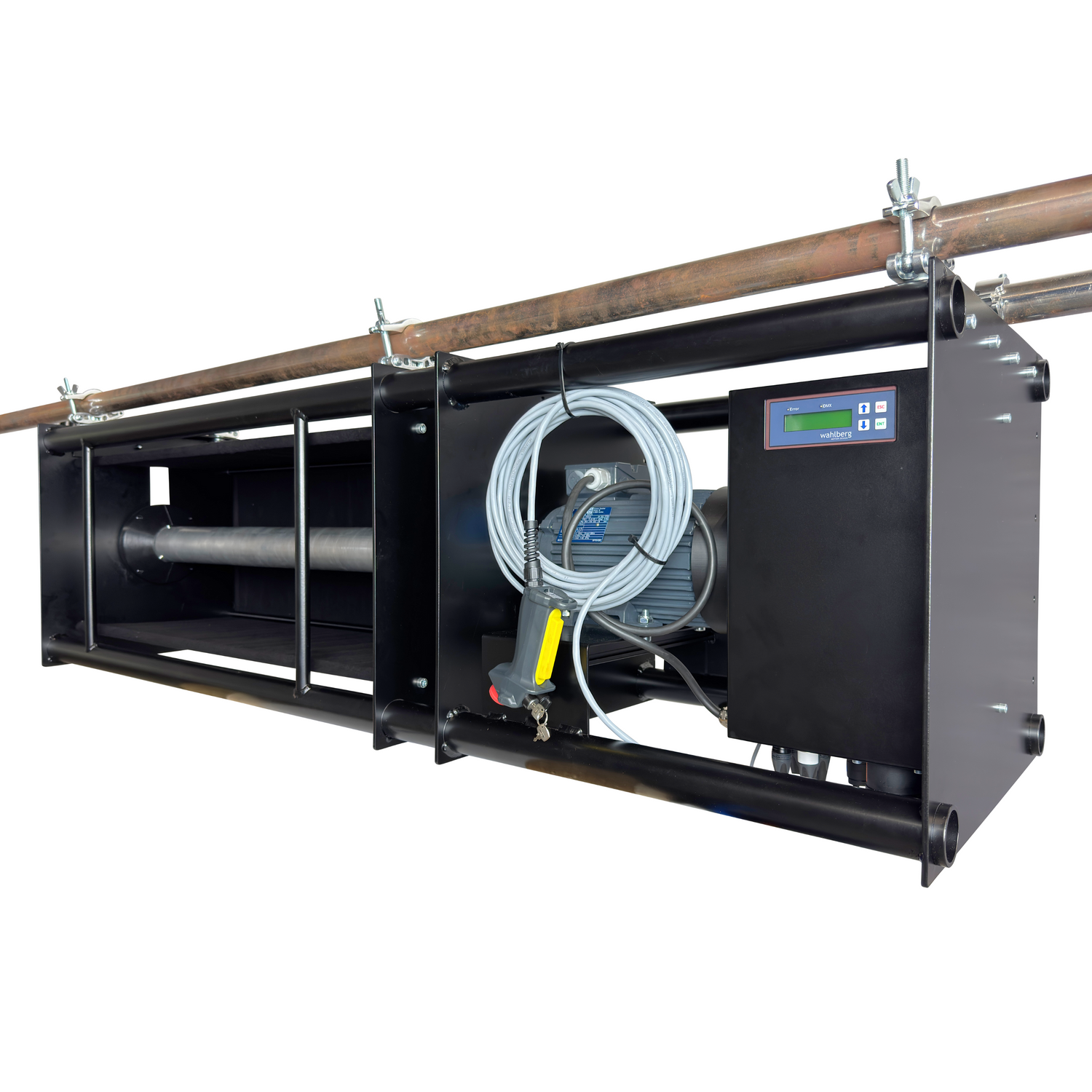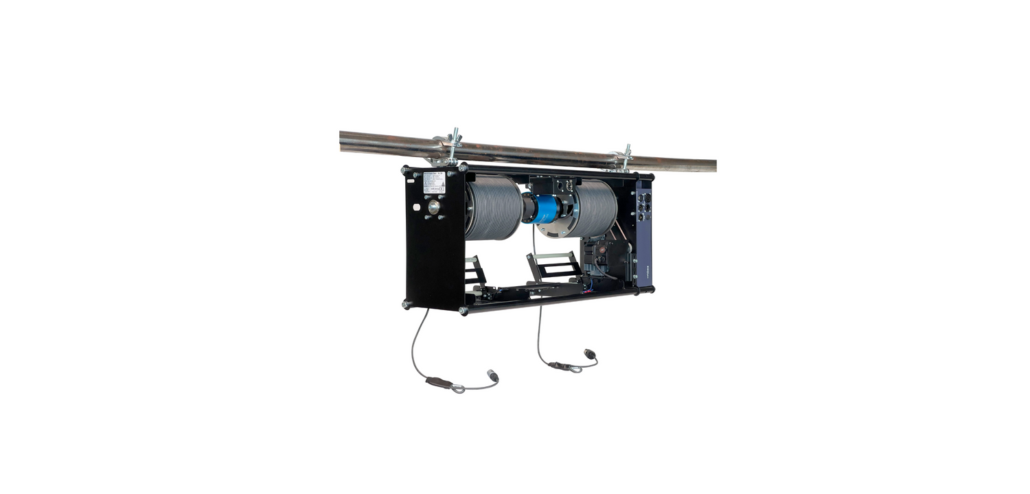 This system also allows for powering equipment via the separately powered lifting wire, delivering 230 V at 5 amps to the suspended unit. It's ideal for lifting heavier electrical stage equipment up to 25 kg, such as lamps, lasers, and chandeliers.