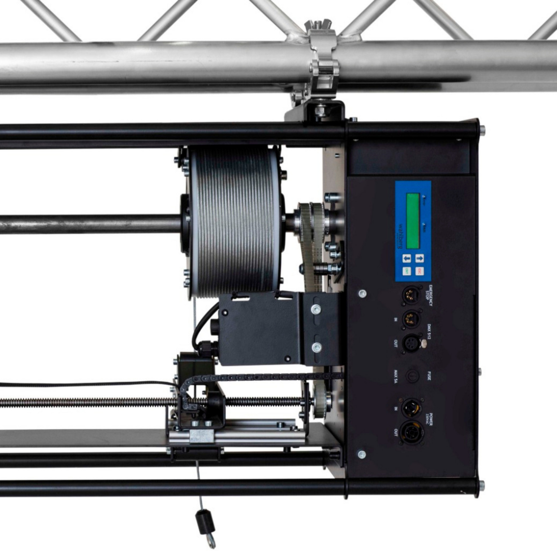 The double wire secures extra stability of the objects, so they don’t rotate. You can easily control all movements of the winch with the integrated DMX control.