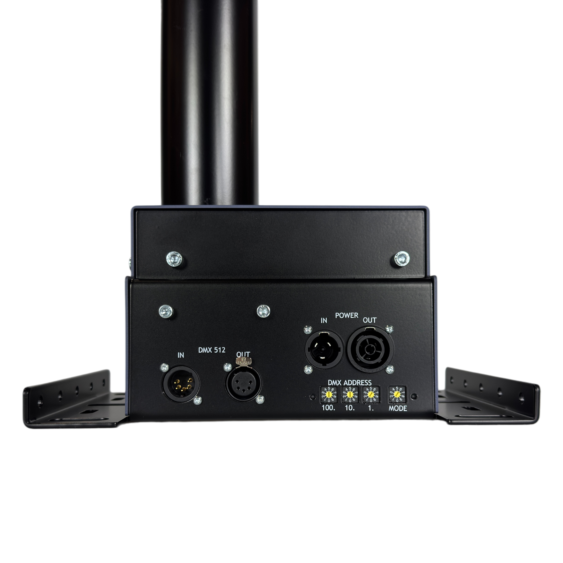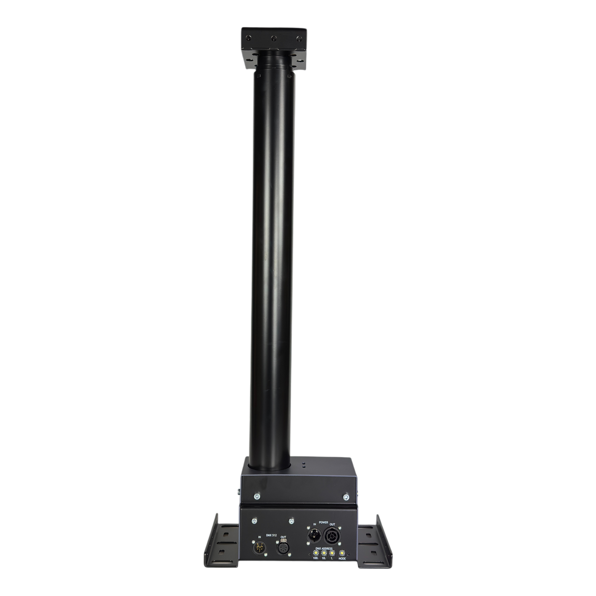 The Lifting Column is designed with an integrated DC Motor Controller. This is a great advantage because it is very easy to control since you can control everything directly from your lighting desk via DMX. It is a very compact design with an integrated guide and actuator lifting your equipment up to 97 cm – from a height of 85 cm to 182 cm.